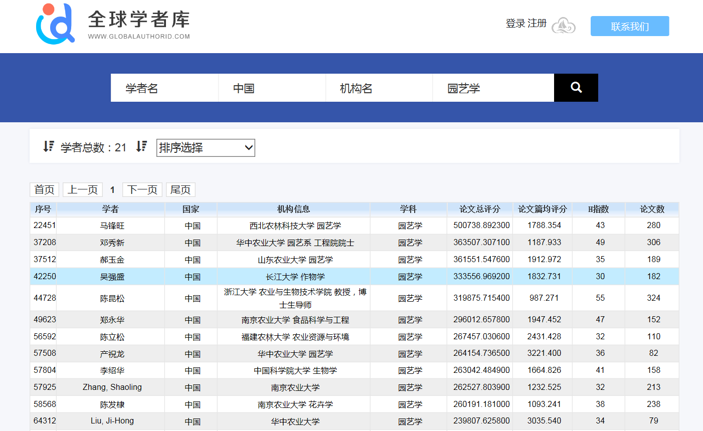 近日,国内全球学者库网站(http://www.globalauthorid.com/)公布了“全球顶尖前10万科学家排名”。公司英国威廉希尔公司吴强盛教授以论文总评分333556.9692、论文篇均评分1832.731、论文数182、H指数30,入选该项排名,位居全球42250名,在国际园艺学科排名第23位,国内园艺学科排名第4位。