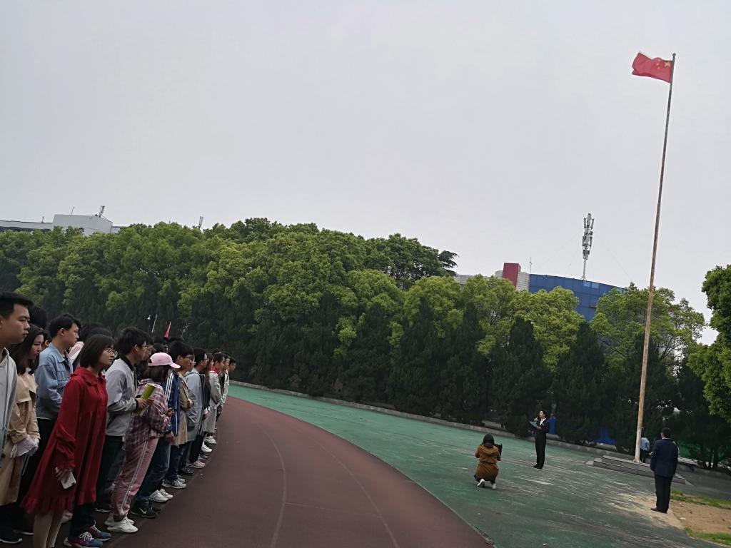 活动伊始,伴随着嘹亮的口号声和整齐的脚步声,国旗护卫队将国旗送上旗台,全体师生行注目礼,高唱国歌,国旗徐徐升起。护卫队退场后,孙老师讲话,他首先通报了学院前一段时间加强学风建设而开展的系列活动,如:召开年级学风建设大会,学风建设主题班团会、学业警示大会、班长、团支书座谈会;先后出台了系列规章制度,如:《学院学风建设方案》、《班级学风建设考核方案》、《寝室文明公约》、《寝室学风建设考核方案》等,然后指出:今年是学校“双一流”建设的关键之年,也是学风建设年,需要同学们认真落实”四走,三早”情况,勤奋学习,积极进取,做好学业规划,同时高度重视防溺水、防盗,防火,杜绝非法校园贷等,注意即将到来的“五一劳动节“人身安全和财产安全等。