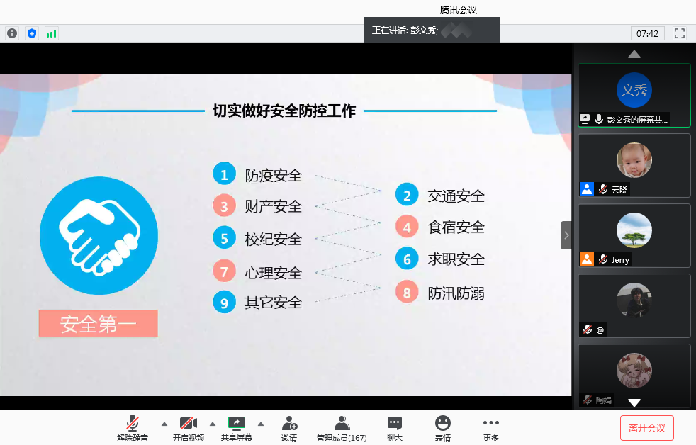 会议伊始,彭文秀围绕疫情防控和安全教育方面对全体毕业生提出两点要求。首先,严格执行安全返校指南。从返校前后各环节全力配合学校返校疫情防控工作,做到平安有序进校、规范手续离校;同时,切实做好安全防控工作,从防疫安全、交通安全、财产安全、食宿安全、校纪安全、求职安全、心理安全、防汛防溺,以及其它安全问题做好提醒和教育工作。