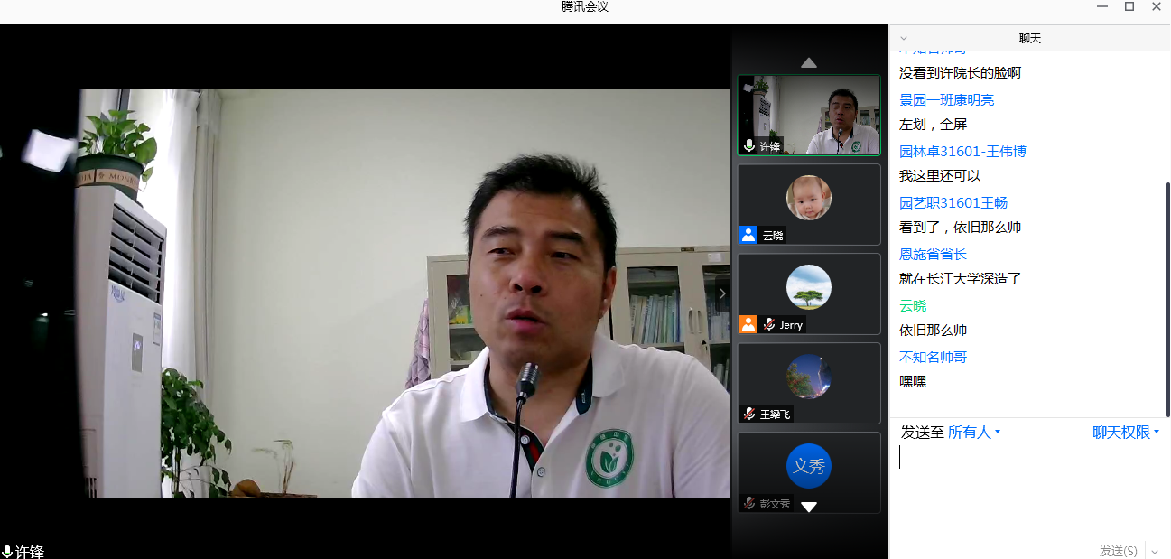 最后,许锋做总结发言。第一,疫情防控时期的毕业季,虽少了学位授予、合影留念的仪式感,但师生情谊、同学情谊丝毫不减;第二,院学工和各部门严阵以待,做好充足准备,欢迎大家返校。希望大家按照学校要求,遵守校纪校规,完成返校程序。第三,祝福即将成为员工的伙伴们,前程似锦、大展宏图,欢迎常回母校看看。