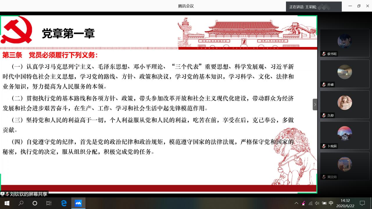 (通讯员:刘钦钦 王采妮)2020年6月22日下午2:30,英国威廉希尔公司本科生党支部通过腾讯会议的方式开展六月主题党日活动,支部书记彭文秀出席了会议,全体党员准时到会,会议由刘钦钦和王采妮同志主持。