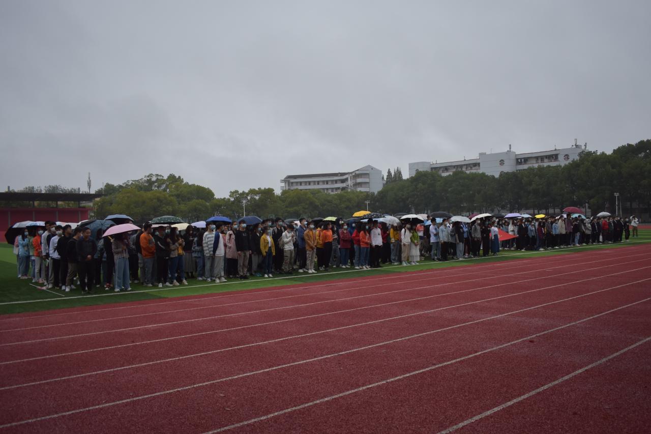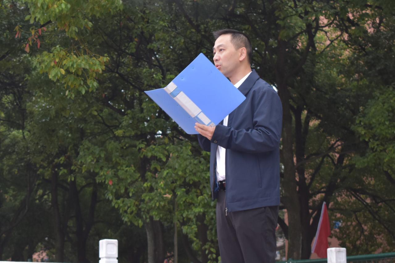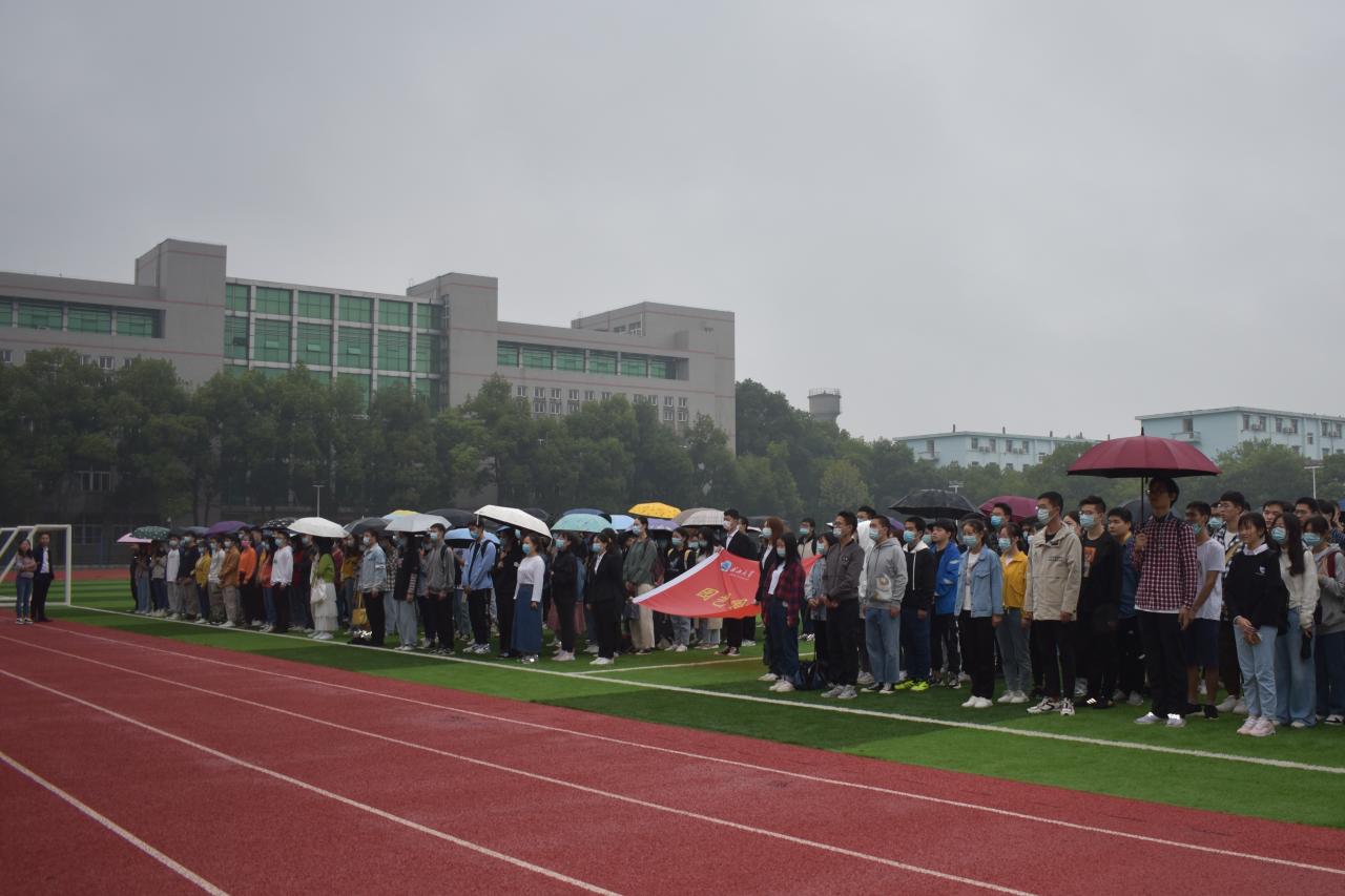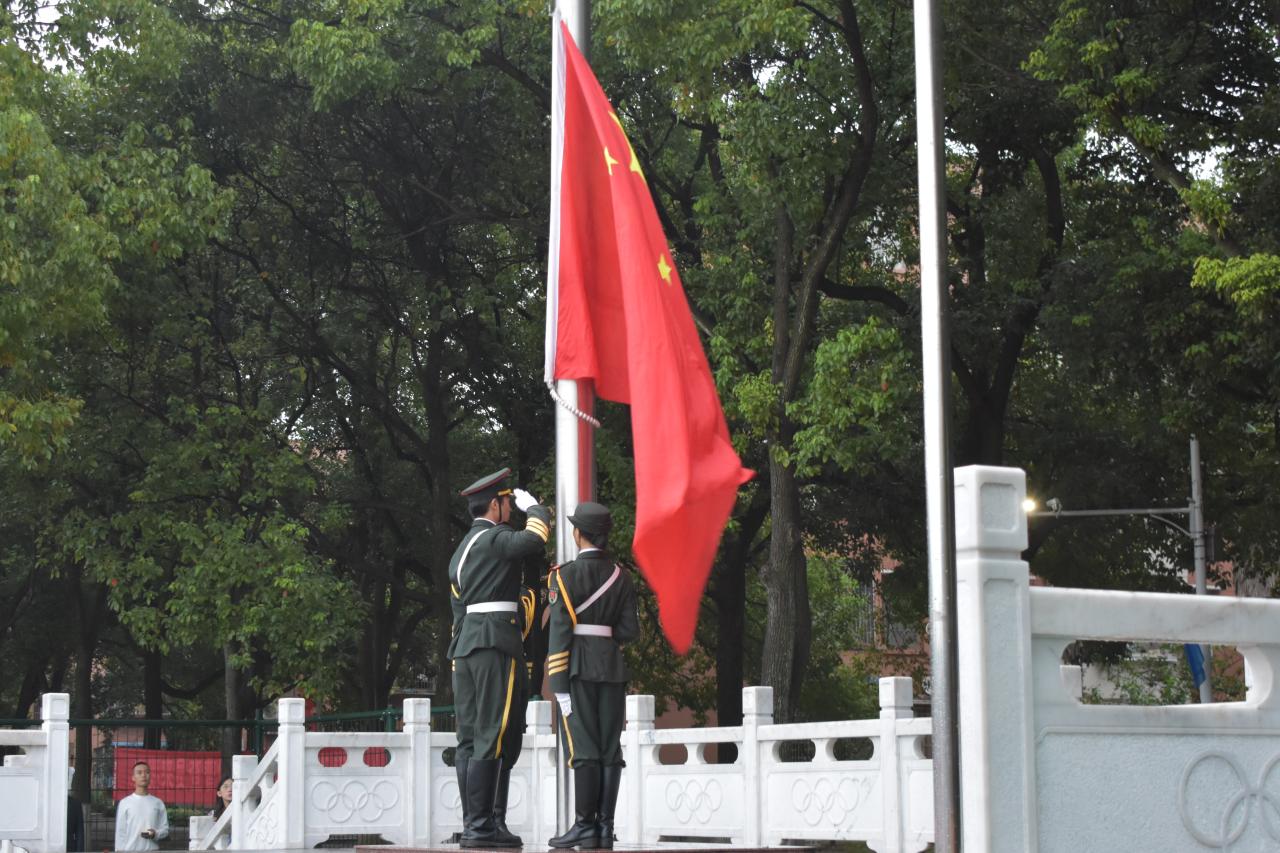 七点整,全体与会人员准备就绪。国旗护卫队迈着铿锵有力的步伐,庄严的护送着五星红旗走向升旗台,台下全场肃穆。在激昂的《义勇军进行曲》中,升旗手振臂一挥,鲜艳的五星红旗冉冉升起。在蒙蒙细雨中,全体师生向国旗行注目礼,深怀对祖国无限的热爱和崇高的敬意。