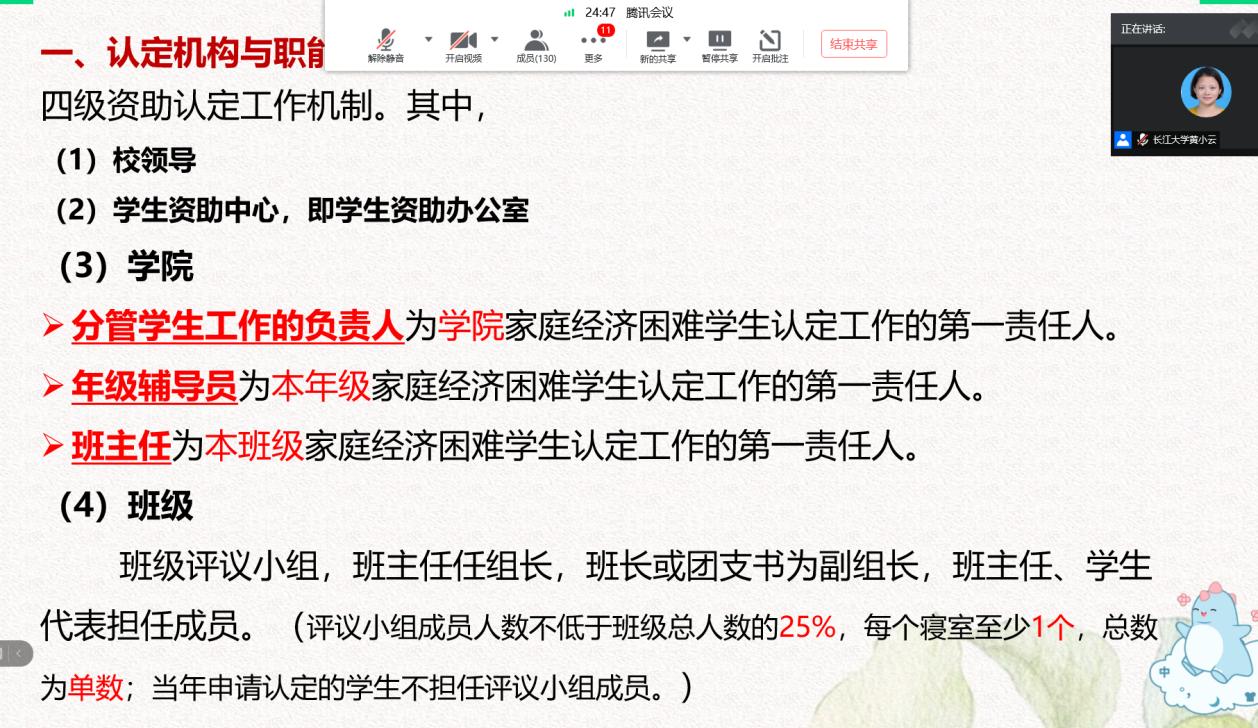 此外各年级辅导员,通过线上线下相结合方式,开展了本年级政策宣讲会。政策宣讲后,各班级班主任深入班级有序开展班级贫困生认定班会,认真细致完成评定工作,力争为后期的国家助学金评审工作打下良好基础。