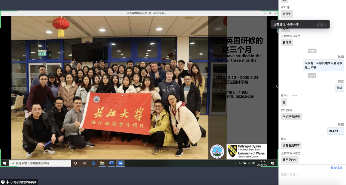 最后,同学们通过聊天室与两位主讲人从论文写作,英文文献查阅,英国风土人情等方面进行了充分的交流,并表达了对张俊和付巧林两位同学真挚的祝贺。据悉,本次的短期研修活动是由研究生院和国际交流与合作处共同举办,全校共60余位研究生参加了本次赴英国短期研修班。