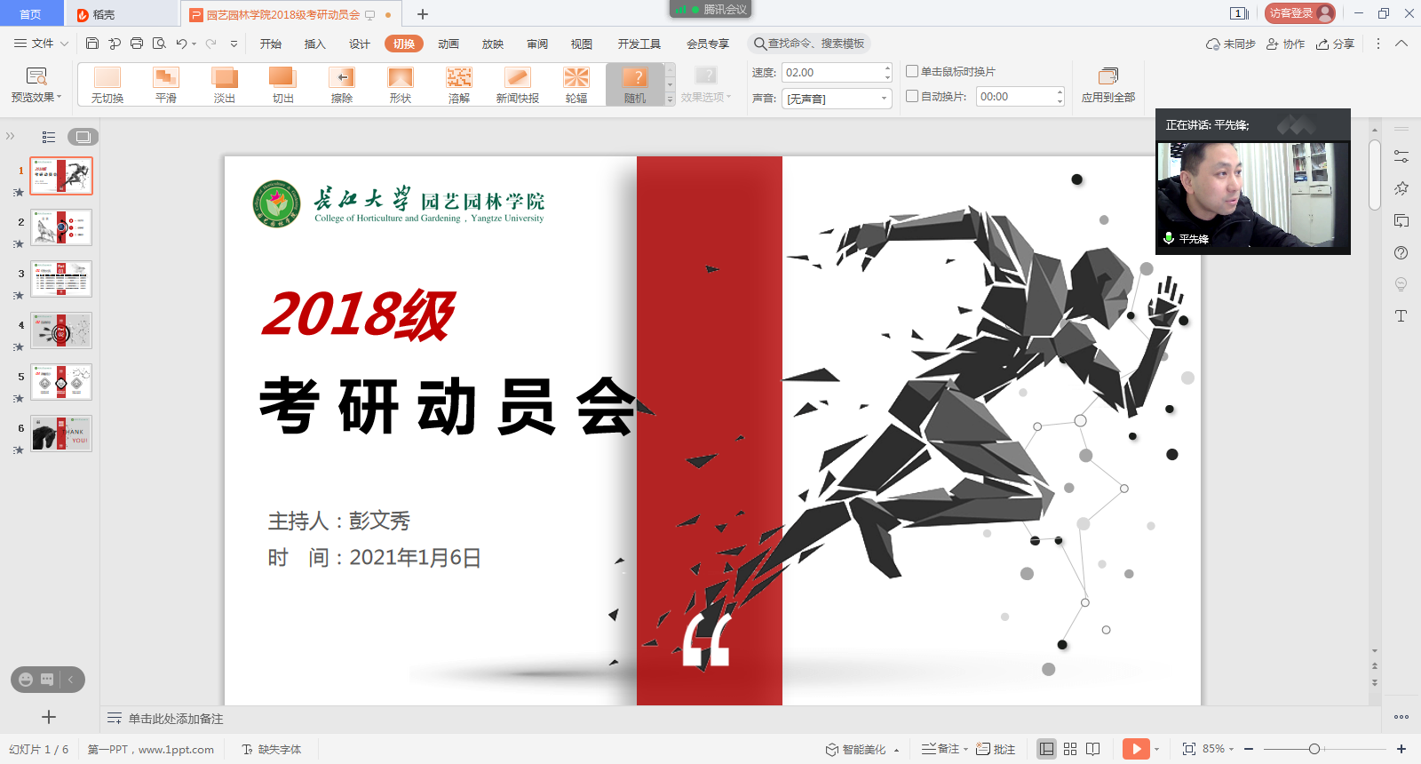 (通讯员:王挪 彭文秀)2021年硕士研究生招生考试刚刚结束,为了更早、更好地激发2018级本科生的考研热情和信心,帮助大家端正考研态度,解决备考过程中遇到的问题,英国威廉希尔公司于2021年1月6日10:00-12:00通过腾讯会议召开了2018级本科生考研经验交流暨动员大会。此次会议由学工办主任彭文秀主持,公司党委副书记平先锋参加了会议。