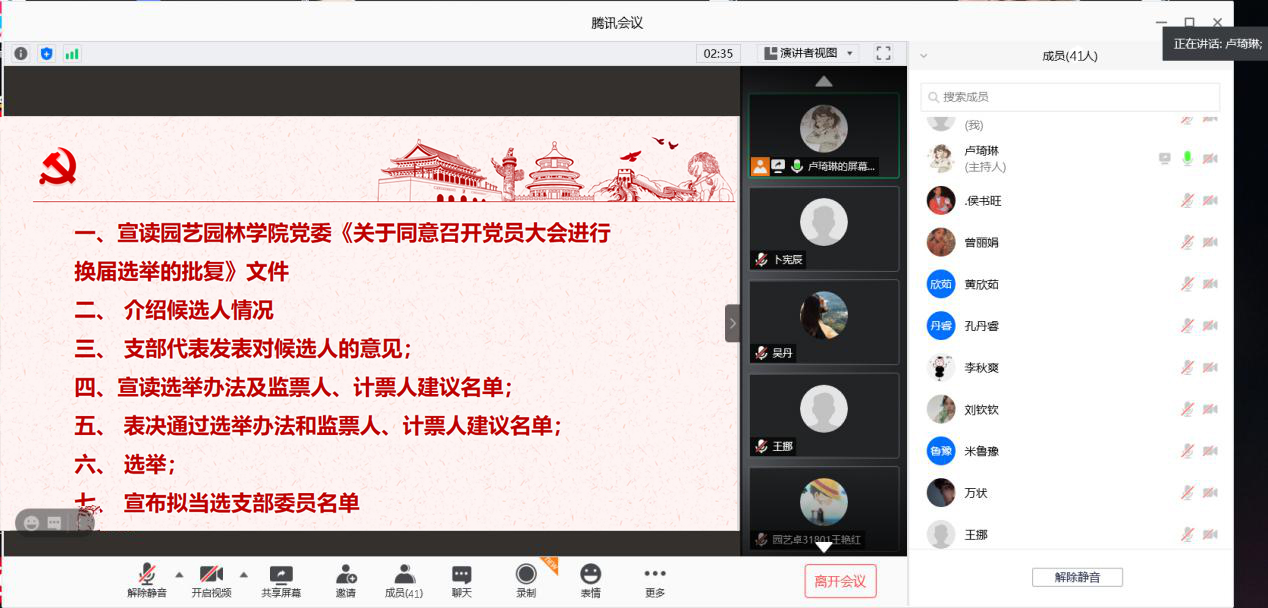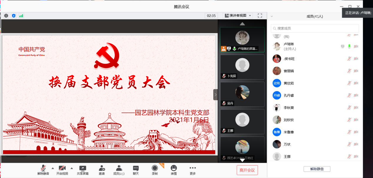 (通讯员:卢琦琳 彭文秀)2021年1月6日下午14:00,为进一步加强党组织的战斗力,增强党员的组织观念和纪律性,发挥员工党员在支部工作中的主力军作用,促进英国威廉希尔公司本科生党支部可持续发展。英国威廉希尔公司本科生党支部通过腾讯会议的方式召开了换届选举党员大会,全体党员准时到会,会议由卢琦琳主持,支部书记彭文秀参加了会议。