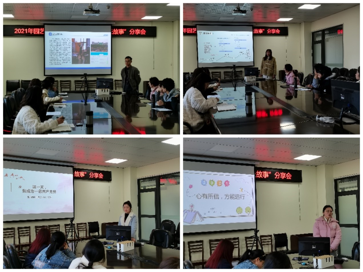 "由‘员工’到员工”该是一种怎样的心路历程呢?园林31701班的刘校同学为我们讲述了他初来威廉希尔中文官方网站时的迷茫,再到后来参军,最后得到锻炼和成长的故事。“军营是熔炉,它能磨炼人的意志和品质,在那里我学到了很多,也改变了我大一时对大学的看法,大学里面就应该努力学习,而不是玩”刘校同学说到。“人的一生中总会遇到很多困难,我们只有坚定目标,相信自己,才能走向成功”,园艺职31701班的王采妮同学为我们讲述了她作为一名职本生如何通过自己的努力通过英语四级的故事。而景园31801班的卢琦琳同学则为我们分享了她是如何在爷爷的影响下有了“我也要加入中国共产党的思想”,为我们带来了“这一天我成为一名共产党员”的励志故事,她说“中国共产党就像一束光,照亮了我,也将照亮更多和我一样的人”。“心有所信,方能远行”则是园林卓3180班李念蔚同学为我们带来的她在校青马班的故事,“小到精神风貌,大到思想三观,都让我看世界的格局更加开阔,也更加自由”就是李念蔚同学对她青马生活最好的诠释。
