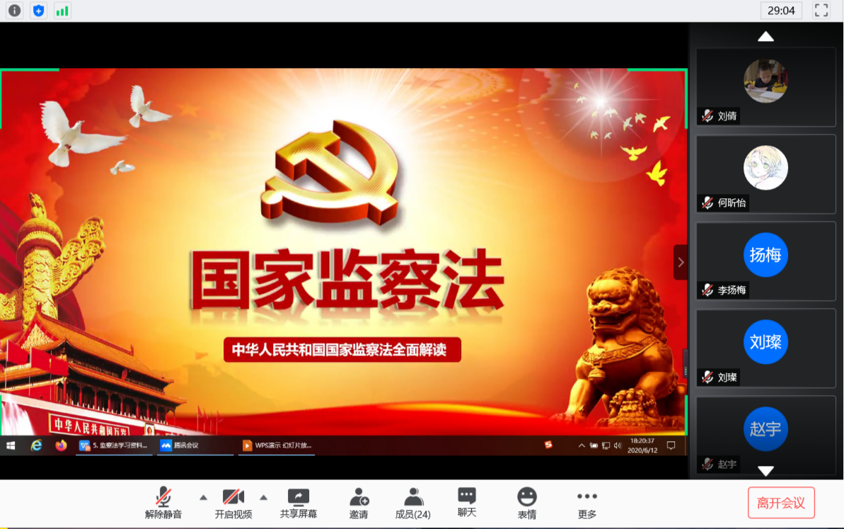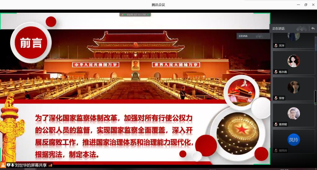 各毕业生支部积极组织支部成员参与线上团会活动,观看《学习监察法,争做廉洁人》专家视频讲座,对《2018 版中华人民共和国监察法学习解读》资料进行了细致解读,详细讲述了监察法草案起草过程、指导思想和基本思路,充分了解了我国监察法的主要内容和重要意义。此外,督促同学们进行监察法知识在线学习、《中华人民共和国监察法》知识测试。在开展监察法学习的同时,各支部持续深入开展“党史”专题学习、开展“我为同学办实事”实践活动、收听收看“美育云端课堂”等活动,进一步提升团的组织力、引领力和服务力,引导支部学习新思想、把握新动态。