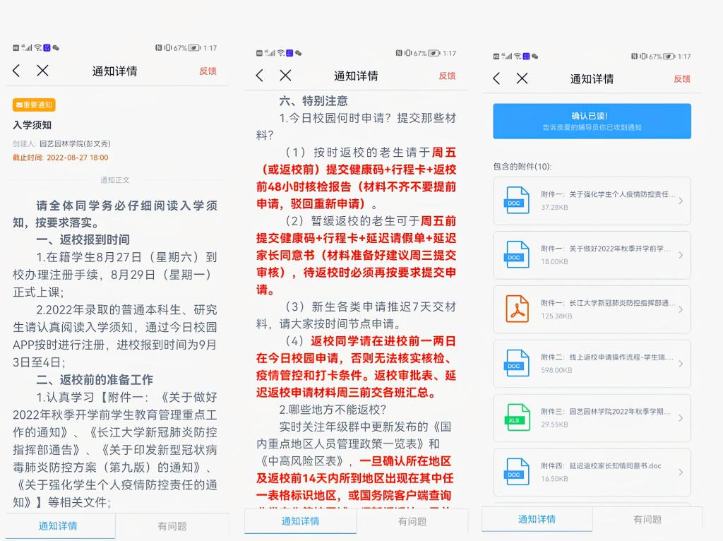 此外,学院学工办将近期学校有关疫情防控和开学返校的通知梳理汇总,通过今日校园向全体员工(含新生)发布开学须知和附件,保证全体同学阅读学习并确认。