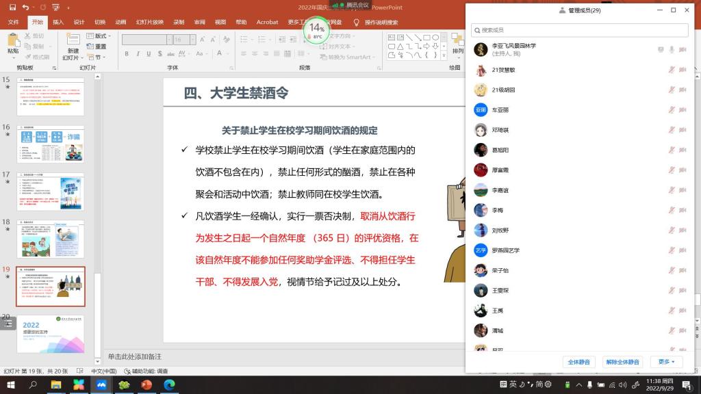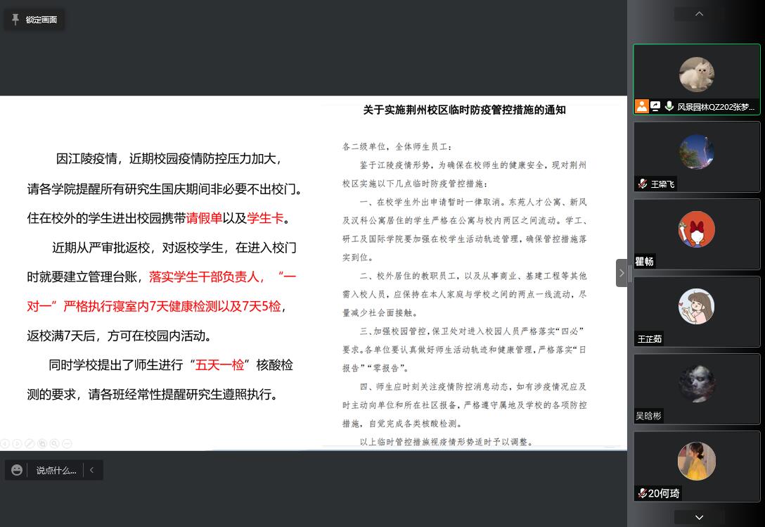 班会上对当前研究生离校请假、返校审批政策进行了详细解释,对于研究生日常教育管理、奖资助政策等内容进行了宣讲,同时再次强调反电信诈骗、防溺水和老员工禁酒令等相关要求。