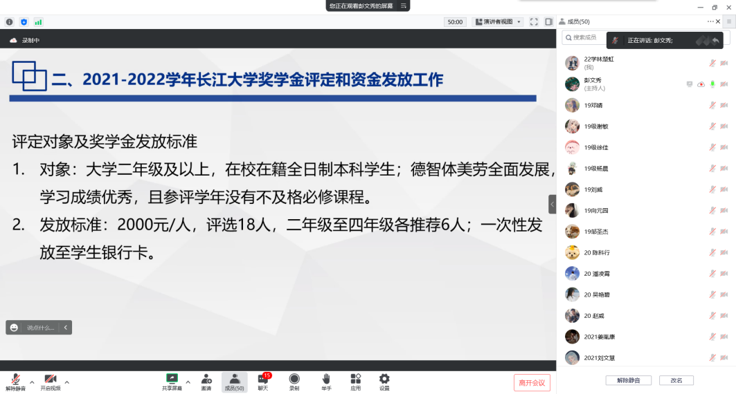 最后,彭老师耐心地回答了参会人员的问题。本次会议明确了工作内容、工作目标和工作流程,为2022年本科生各项资助工作的顺利开展做了保障,可以有效地减少工作中的失误,为有需要的同学提供帮助,切实保证国家各项员工资助政策落到实处。