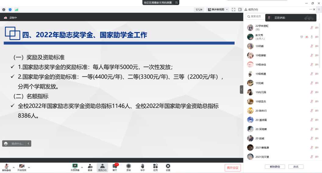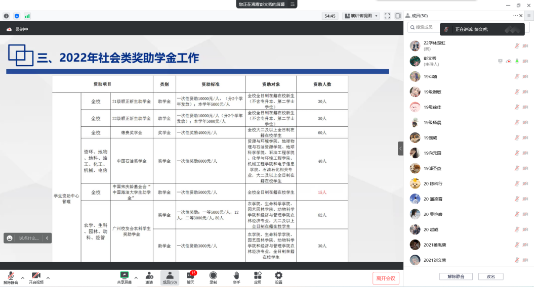 随后,彭老师就2021-2022学年威廉希尔中文官方网站奖学金评定和资金发放工作通知进行了强调,同时,对2022年社会类奖助学金工作和2022年励志奖学金、国家助学金工作进行了一个预通知。