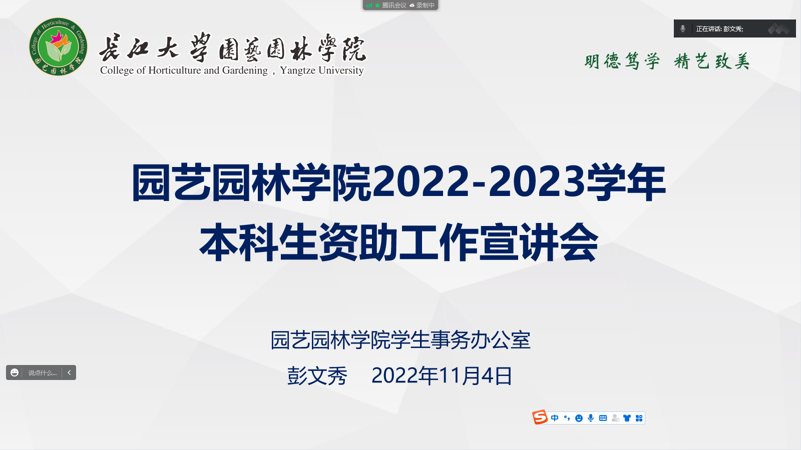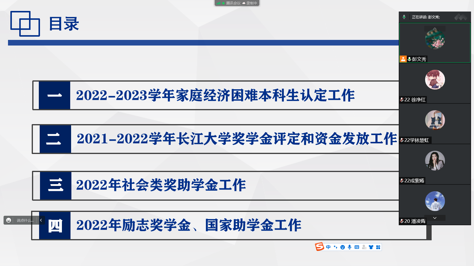 此次会议从四个部分展开,对2022-2023学年家庭经济困难本科生认定工作、2021-2022学年威廉希尔中文官方网站奖学金评定和资金发放工作、2022年社会类奖助学金工作以及2022年国家励志奖学金、国家助学金在内的四方面资助工作内容进行了宣讲培训。