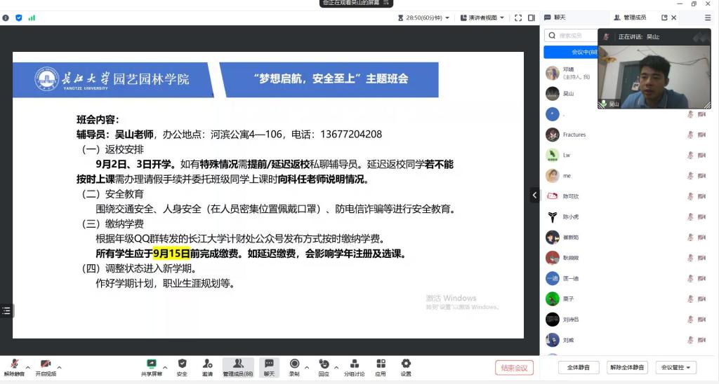 会议过程中,吴山老师向同学们传达了新学期开学注意事项,包括报到时间安排、学费缴纳等内容,同时对同学们进行安全教育,围绕交通安全、人身安全等,尤其是防诈骗安全教育,针对近年来学校多起诈骗案例,帮助员工提高对诈骗的认知,增强对诈骗的风险防范意识。