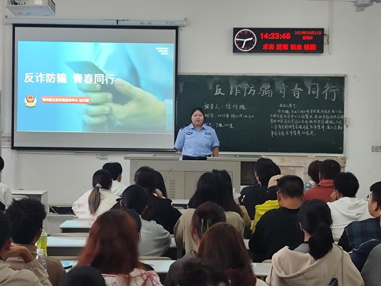 (通讯员:代熙本)为进一步增强员工防范电信网络诈骗的安全意识,有效遏制电信网络诈骗犯罪的发生,增强学院学子自我信息财产保护能力。9月21日,公司于西校区7教102教室开展“反诈防骗,青春同行”反诈骗宣讲。本次主讲人是荆州区公安分局反诈中心三级警长徐付蝶。