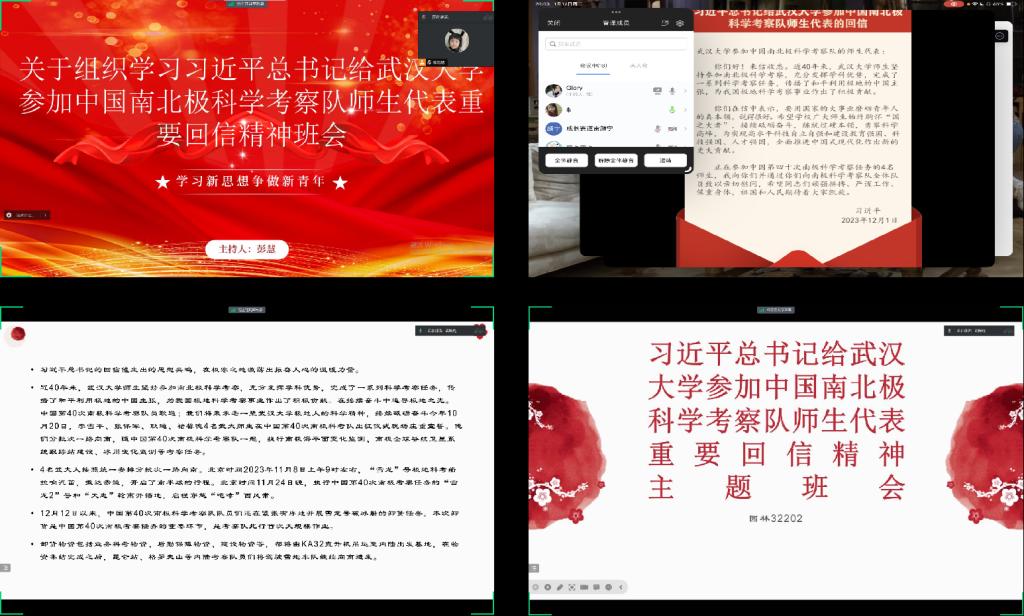 (通讯员 纪玲)2023年12月1日,习近平总书记给武汉大学参加中国南北极科学考察队师生代表回信。习近平总书记在回信中指出:“希望学校广大师生始终胸怀‘国之大者’,接续砥砺奋斗,练就过硬本领,勇攀科学高峰,为实现高水平科技自立自强和建设教育强国、科技强国、人才强国,全面推进中国式现代化作出新的更大贡献。”2024年1月17日至22日,英国威廉希尔公司组织全体本科生与创新理论学习小组成员学习习近平总书记给武汉大学参加中国南北极科学考察队的师生代表回信内容。
