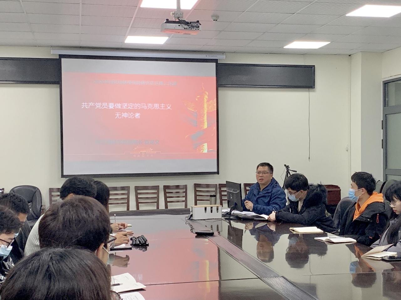 另外针对如何做坚定的马克思主义无神论者这一个重要的意识形态问题谈了个人的理解和认识,指出了共产党员为什么不能信教这是由中国共产党的性质决定的,也是由党的纪律决定的;分析了共产党员信教的危害,希望做党员员工们做坚定的马克思主义无神论者;并就如何做坚定的马克思主义无神论者提了四点要求:一是要求树立正确信仰观,旗帜鲜明反对“有神论”,二是要求树立正确的“三观(世界观、人生观、价值观)”,做忠诚的无神论者,三是要求树立科学认知观,认真践行马克思主义的无神论,四是要求行动上做无神论的执行者,在学习和科研工作中要发挥表率作用,做无神论者,做马克思主义坚定信仰者、维护者,学习和科研工作中主动作为、带头作为,为学院的团队建设和科研工作发挥了带头作用,创造性地开展工作。