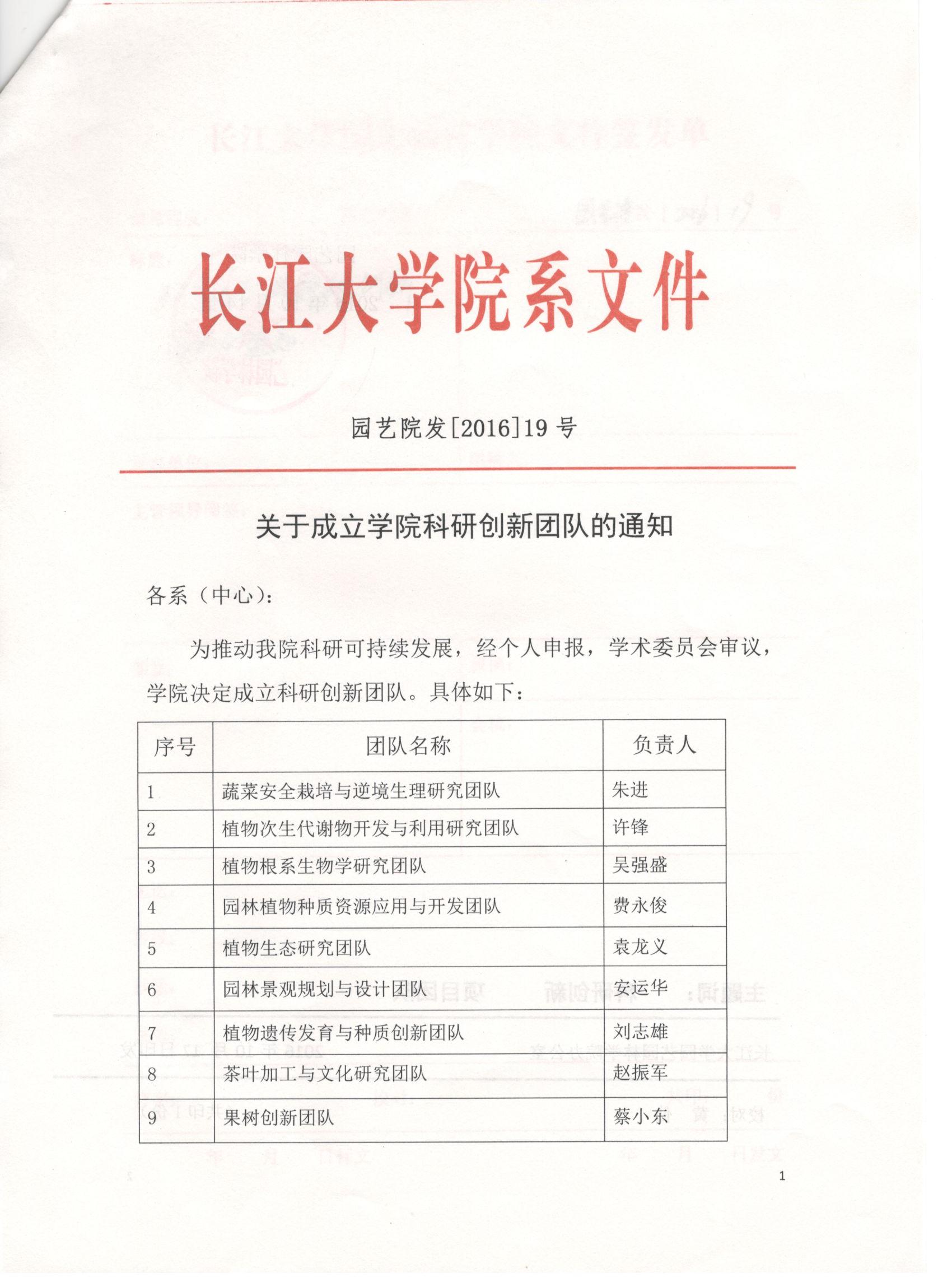 园艺院发[2016]19号-关于成立学院科研创新团队的通知