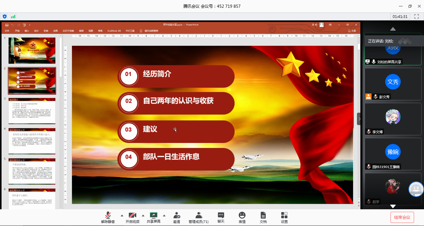 紧接着,2017级退伍员工刘校同学分享了他的两年军旅经验,给大家呈现一个真实的军旅生活。他说入伍最大的收获是性格的补充、思想的成熟和习惯的养成。刘校同学为与大家分享了部队的生活点滴,从入伍前思想准备、入伍后经验教训各方面给出详细的建议,帮助大家明确自身的入伍意愿与选择。最后,他鼓励同学们以知识分子的身份投身军营,为军队的转型建设贡献力量,把握住锻炼提升自己的一次机会。