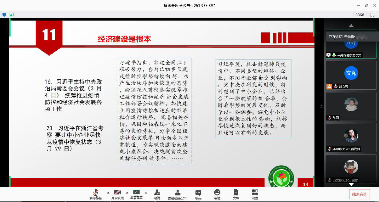 (通讯员:刘力源 彭文秀)为响应学校《关于组织全校本科生学习习近平总书记在新冠肺炎疫情防控期间重要讲话精神的通知》,进一步做好本科生思想政治教育工作,公司开展学习习近平总书记在新冠肺炎疫情防控期间重要讲话精神“云”学习活动。5月15日前,各班级召开主题班团会,做好习近平总书记关于新冠疫情防控讲话精神的专题“云”学习。5月16日上午9:30,公司党委副书记平先锋在腾讯会议平台为公司全体学习小组成员进行一场“云”宣讲,参会人员计178人,同时在QQ群等平台展开“云”讨论。
