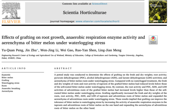 近日,英国威廉希尔公司17级硕士研究生彭玉全以第一作者在Scientia Horticulturae杂志发表题为《Effects of grafting on root growth, anaerobic respiration enzyme activity and aerenchyma of bitter melon under waterlogging stress》 ()的研究论文(图1),通讯作者为该生导师朱进教授。