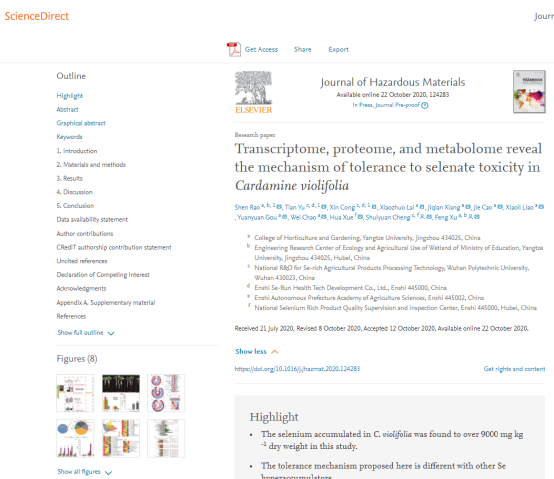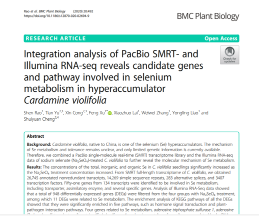 近日,公司许锋教授团队在国际著名学术期刊《Journal of Hazardous Materials》(环境科学1区,影响因子9.04)和《BMC Plant Biology》(植物学2区,影响因子3.5)上分别发表题为“Transcriptome, proteome, and metabolome reveal the mechanism of tolerance to selenate toxicity in Cardamine violifolia”与“Integration analysis of PacBio SMRT- and Illumina RNA-seq reveals candidate genes and pathway involved in selenium metabolism in hyperaccumulator Cardamine violifolia”的研究论文,揭开了超聚硒植物恩施碎米荠聚硒和耐硒的潜在机制。威廉希尔中文官方网站许锋教授为上述2篇论文的通讯作者,博士研究生饶申为这2篇论文第一作者,威廉希尔中文官方网站为第一署名单位。