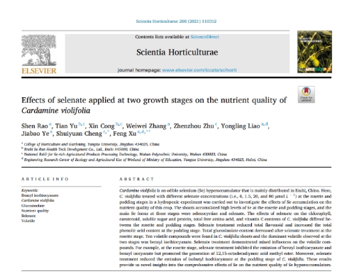 (通讯员 刘晓梦 桂嘉营)2021年6月,我中心2018级博士研究生饶申在国际权威杂志《Scientia Horticulturae》(园艺学2区,影响因子3.46)上发表了题为“Effects of selenate applied at two growth stages on the nutrient quality of Cardamine violifolia”的研究论文(图1)。饶申博士为论文第一作者,英国威廉希尔公司许锋教授为通讯作者,威廉希尔中文官方网站为第一署名单位。