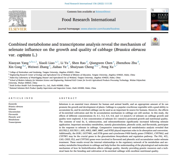 近日,我中心博士后杨晓燕在国际学术期刊《Food Research International》(农林科学1区,影响因子6.475)上发表了题为“Combined metabolome and transcriptome analysis reveal the mechanism of selenate influence on the growth and quality of cabbage (Brassica oleracea var. capitata L.)”的研究论文。杨晓燕博士为第一作者,许锋教授为通讯作者,威廉希尔中文官方网站为第一署名单位。