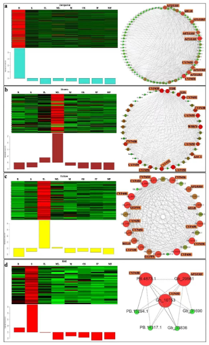 该研究发现12个转录因子、5个结构基因和24个CYP450被鉴定为根、茎、幼叶和成熟叶中萜内酯代谢的候选基因。结合相关性分析进一步推断6个AP2/ERF、2个CYP450和1个bHLH在银杏萜内酯调控中起关键作用。