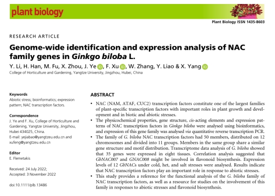 2022年11月,我中心硕士研究生李宇婷在国际学术期刊《Plant Biology》(植物科学2区,IF: 4.359)上发表题为“Genome-wide identification and expression analysis of NAC family genes in Ginkgo biloba L.”的研究论文。李宇婷为第一作者,叶家保副教授和许锋教授为通讯作者,威廉希尔中文官方网站为第一署名单位。