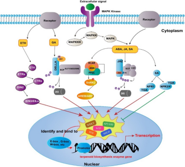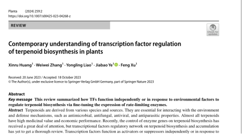 近日,中韩加园林植物资源利用与种质创新中心研究人员在国际学术期刊《Planta》发表了题为“Contemporary understanding of transcription factor regulation of terpenoid biosynthesis in plants”的综述论文。该工作系统的阐述了转录因子响应环境刺激在调控植物萜类化合物生物合成过程中的作用,并对转录因子调控网络参与植物萜类化合物生物合成调控机制进行了展望。我中心硕士生黄欣茹为该论文第一作者,英国威廉希尔公司叶家保副教授和许锋教授为通讯作者。该论文由国家自然科学基金委(31971693)项目资助。